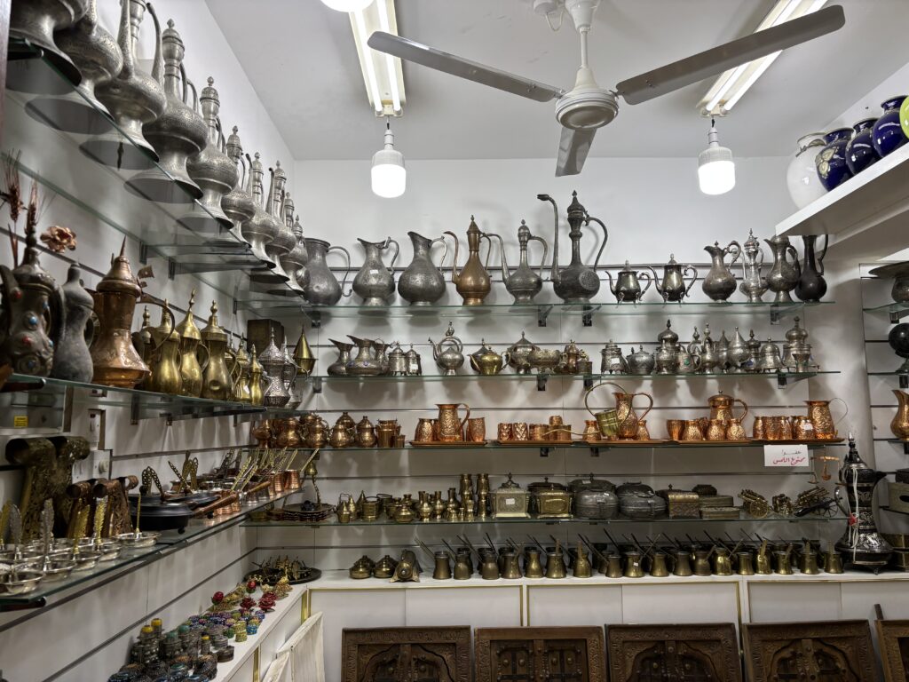 野菜・果物スークの上階にはお土産屋も多く、モザイクランプや真鍮・銀のコーヒーポットなど、アラビア文化の香るアイテムが並んでいた。
