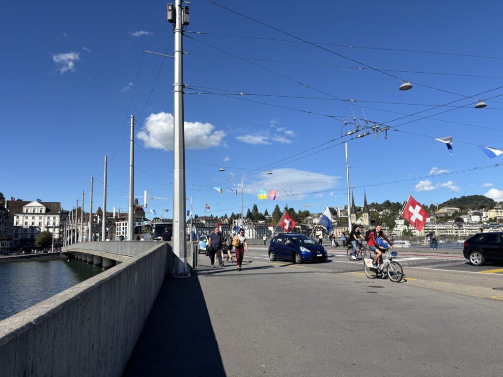 駅前の「ゼー橋」を渡ると、スイス国旗がたくさんはためいていて、「ああ、本当にスイスに来たんだな」と実感が湧いてきた。