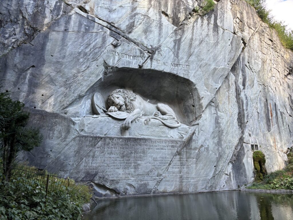 1792年のフランス革命で命を落としたスイス傭兵たちを追悼して作られた記念碑で、岩を削って彫られた巨大なライオンが、盾に寄りかかって息絶えようとする姿がとても悲しげ。