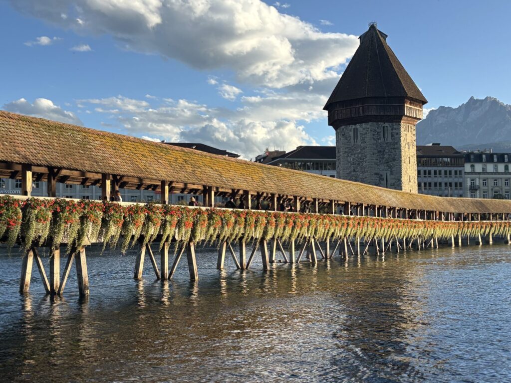 教会を後にして、湖沿いの遊歩道を白鳥を眺めながら歩き、最後にルツェルンの象徴「カペル橋」へ。