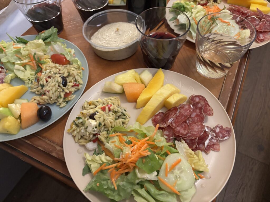 夜ごはんは、スーパーで買ってきたフエット(スペイン風サラミ)、サラダ、フルーツ、パン、野菜ディップなど。