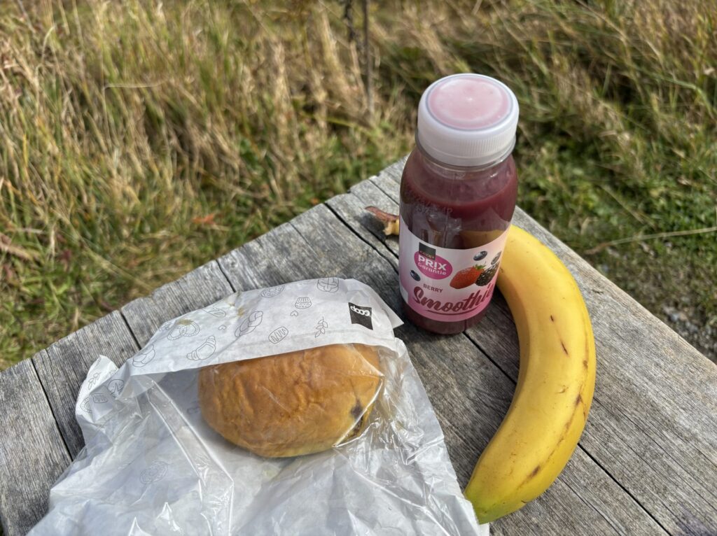 スーパーで買ったパン、バナナ、スムージーというシンプルなごはんだけど、目の前の絶景がなによりのごちそう。