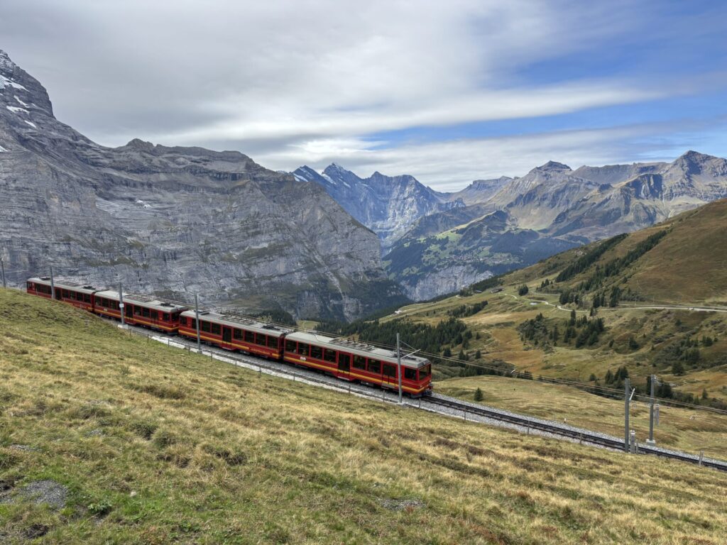 そして、遊歩道のすぐ脇を、ユングフラウヨッホからクライネ・シャイデックへ向かう登山列車がごとごとと走っていく。