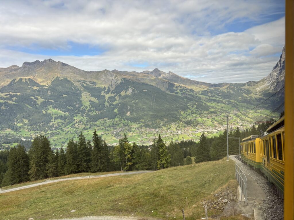 窓の外には、グリンデルワルトの村々や周囲の山々が広がっていて、もうすでに絶景モード。