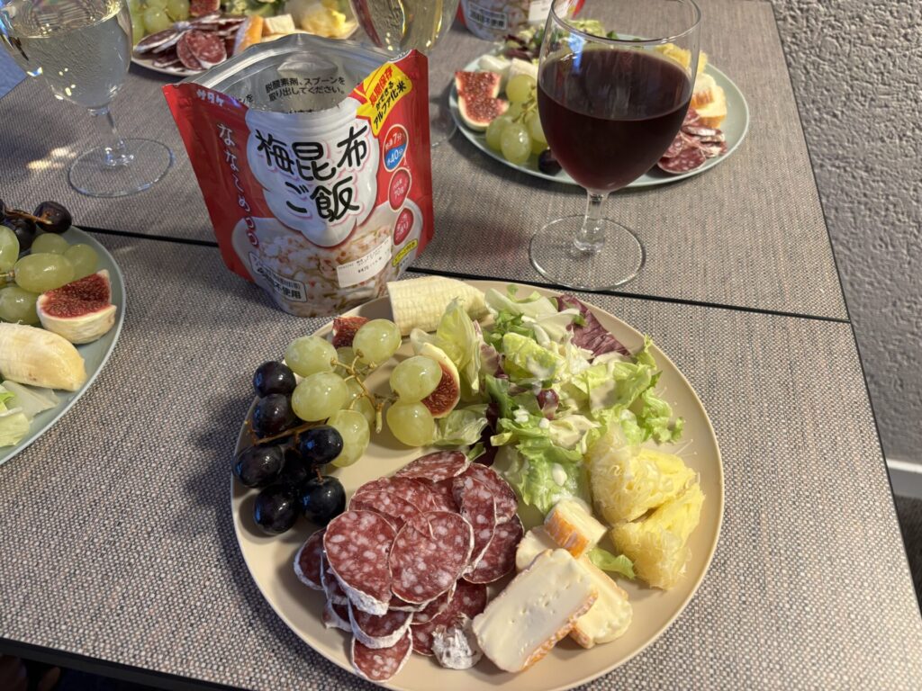 この日の夕食は、フエット(生サラミ)、チーズ、サラダ、フルーツ、そして母が日本から持ってきてくれた「梅昆布ご飯のアルファ米」。
