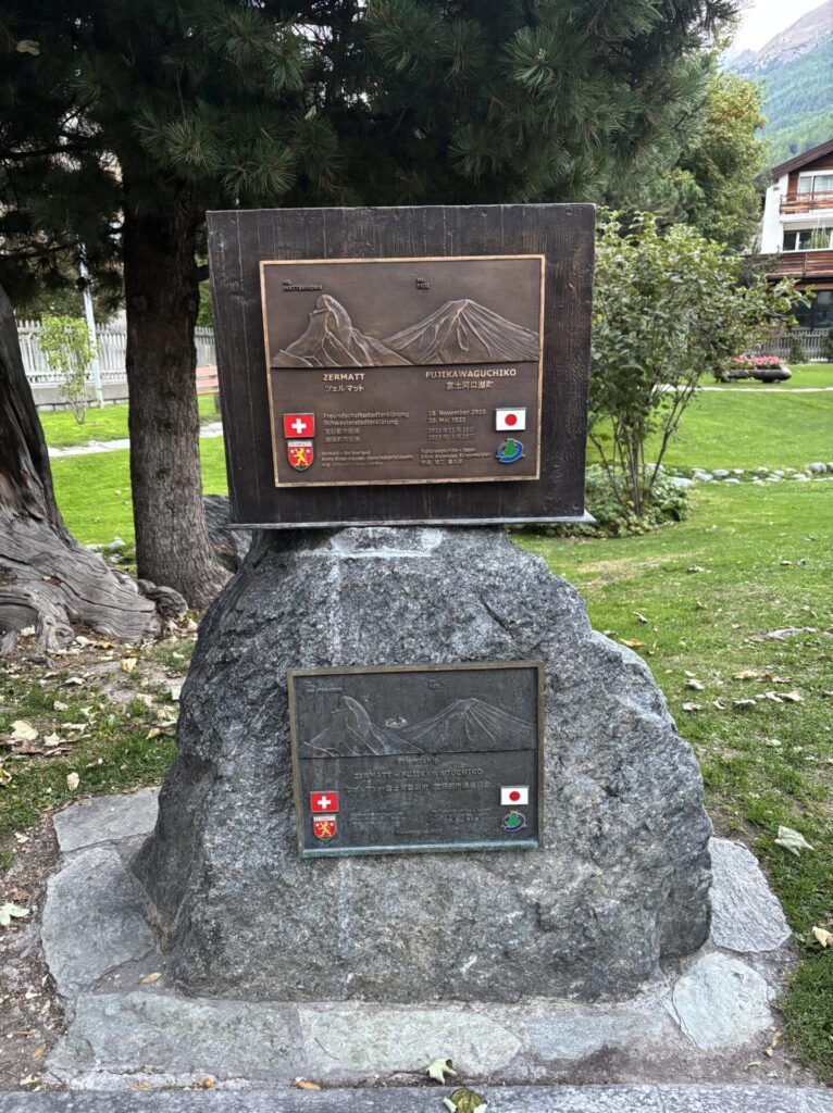 広場の片隅には、富士河口湖町や妙高高原、京都などの友好姉妹都市の記念碑もあり、日本とのつながりを感じられる場所でもある。