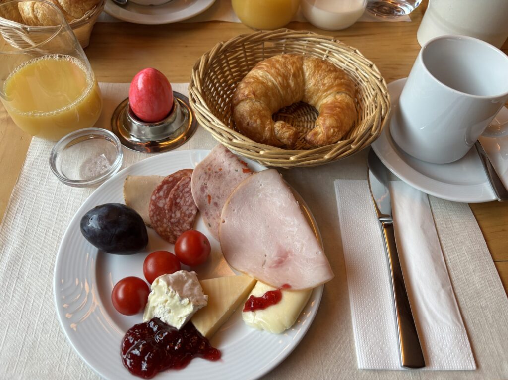 ビュッフェ形式の朝ごはんは、さくさくふわふわのクロワッサン、ホールチーズを自分でカットするスタイルのチーズ、種類豊富なハムなど、どれも美味しくて朝から大満足だった。