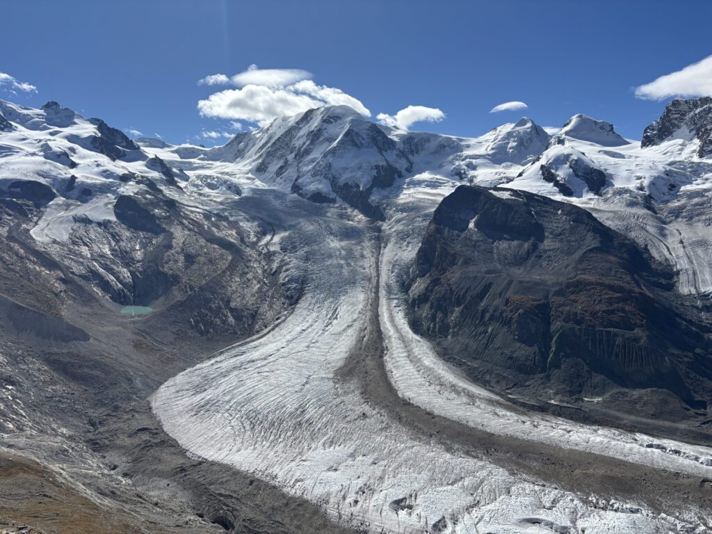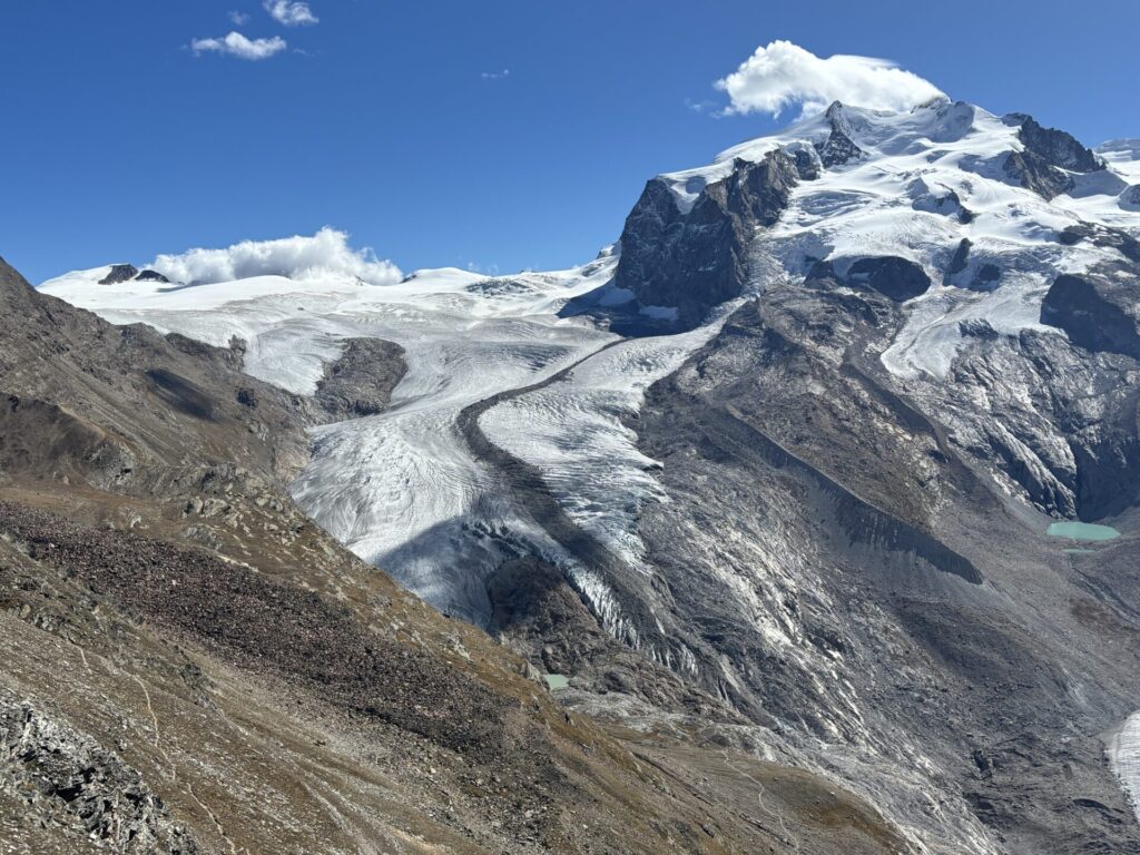 さらに目の前には、標高4527mのリスカムとその下を流れるグレンツ氷河、そしてその隣には標高4634mのモンテローザとゴルナー氷河が広がっている。