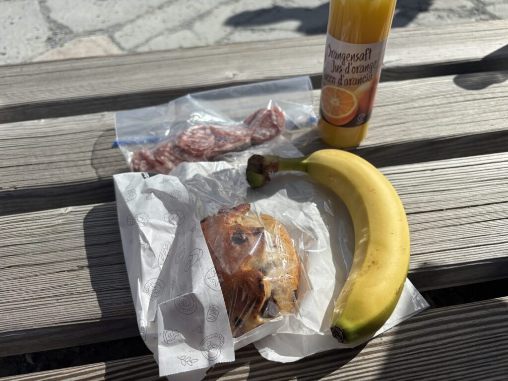 今日のランチは、パン、バナナ、サラミ、チョコ、オレンジジュース。