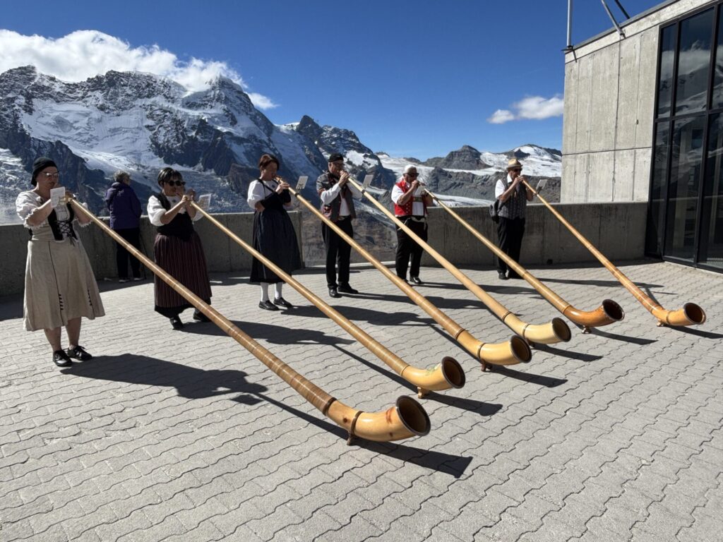 赤いベスト、黒のスカート、帽子など、伝統的な衣装を身にまとった人たちが、ずらりと並んで長いホルンを構える姿は、まるでスイスのポストカードの中に入り込んだみたい。