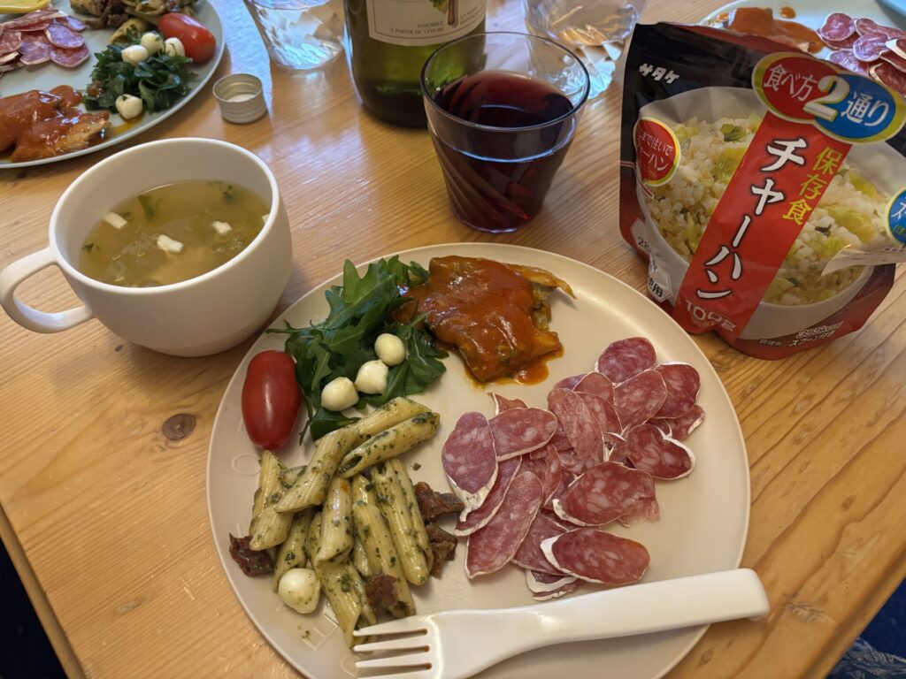 夜ごはんは、パスタや魚の缶詰に加えて、アルファー米で作ったチャーハンや味噌汁など、日本食も取り入れた豪華なラインナップに。