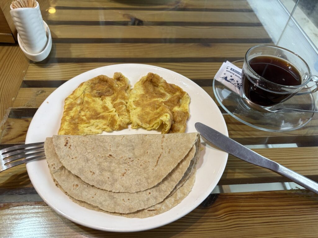 頼んだのは、チャパティ(ネパールの薄焼きパン)とオムレツ、そしてあたたかいコーヒーのセット。