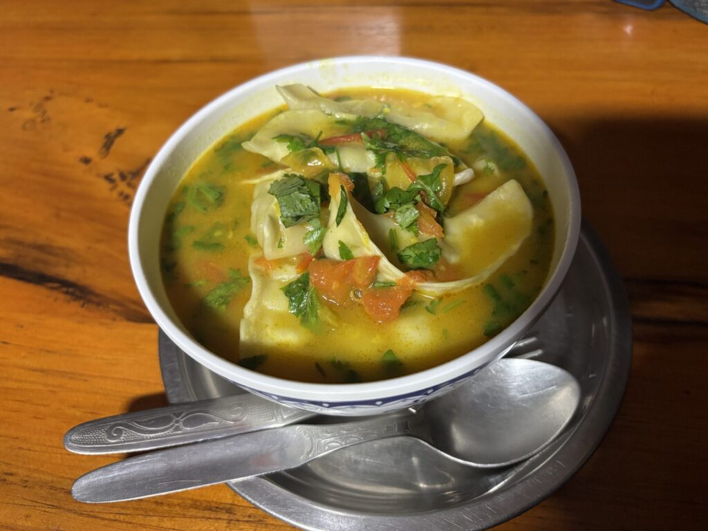 夕食は、体が温まるモモ(ネパール風餃子)入りのスープ。