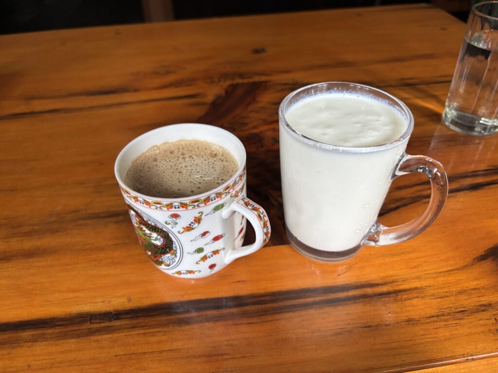 今日の朝食は、パンとラッシー、そしてコーヒー。