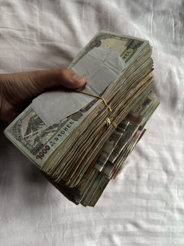 ネパールでは最高額紙幣が1,000ルピー(約1,100円)なので、まとまった金額を持とうとすると、どうしても分厚い札束になる。