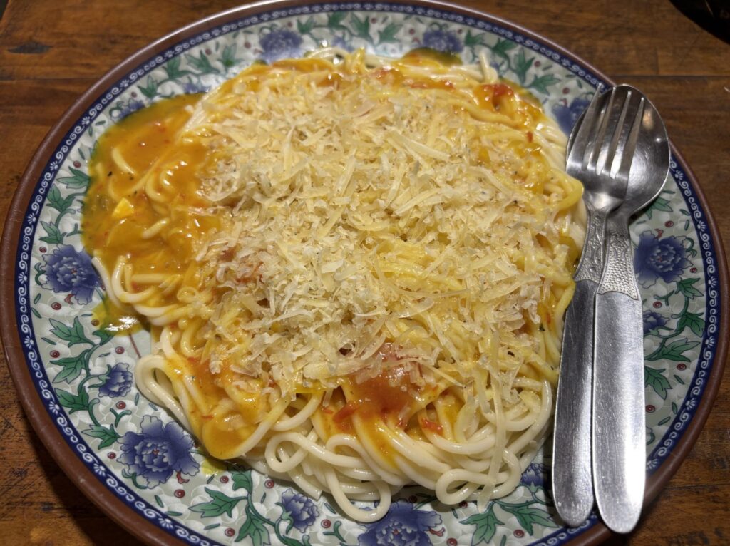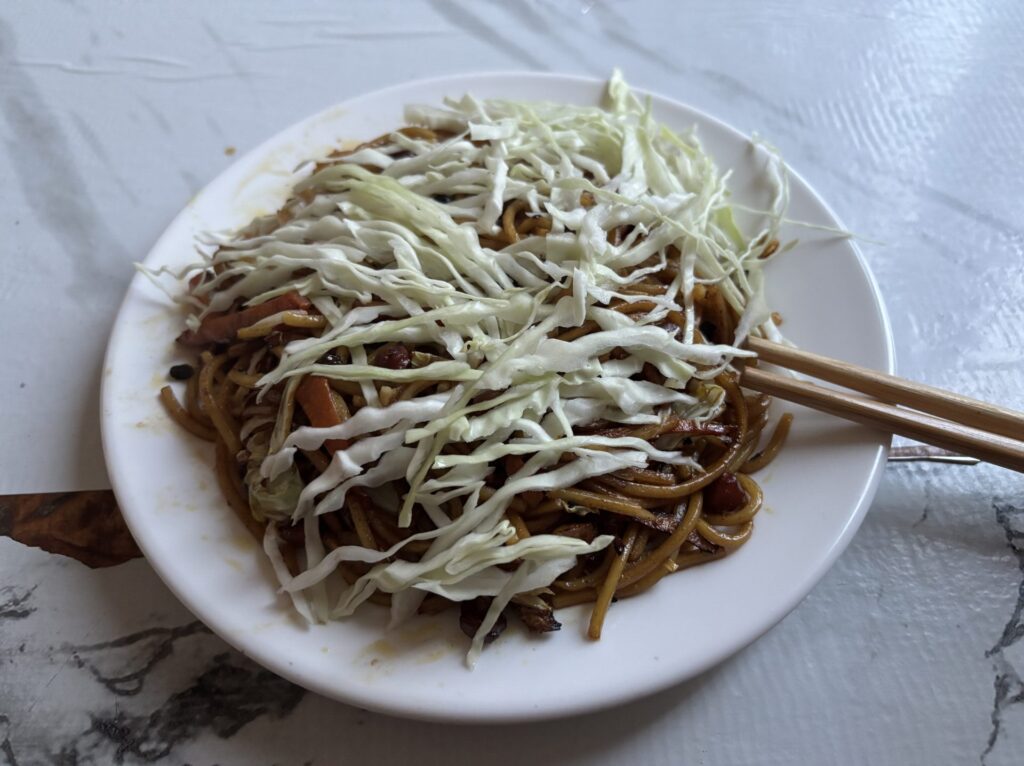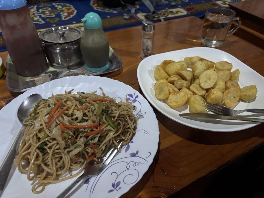 この日の夕食は、チョウメンとじゃがいものグリル。
