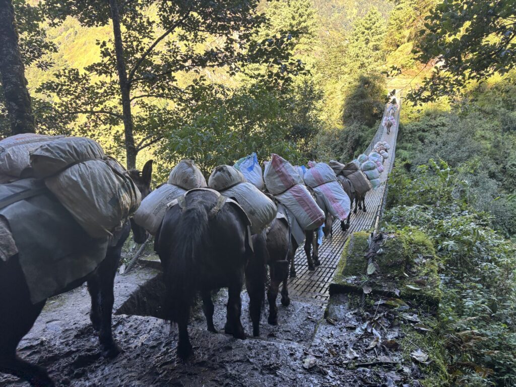 背中に食料や物資を積み、列になって谷を渡る姿は、まさに「ネパールの山岳地帯」といった風景で、見ていて絵になるほどだった。
