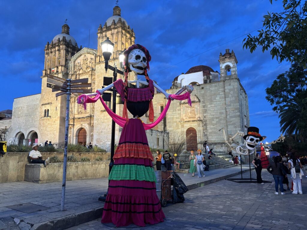 ライトアップされたサント・ドミンゴ・デ・グスマン聖堂の前には、大きなガイコツ人形が飾られていて、写真を撮る人たちで賑わっていた。