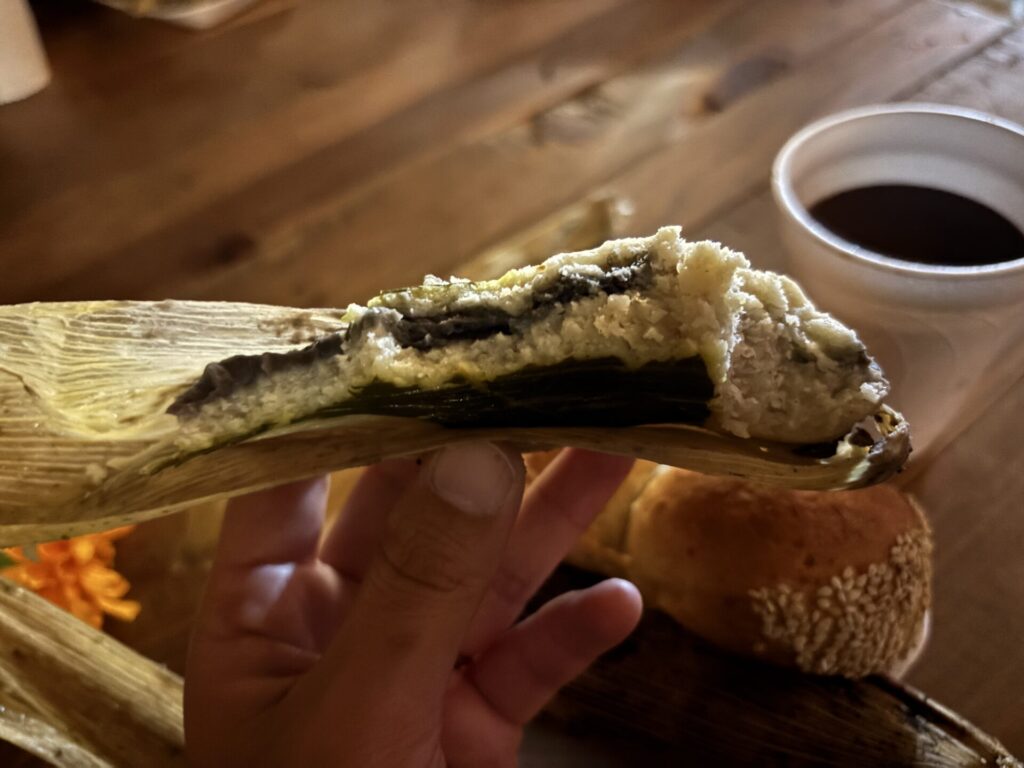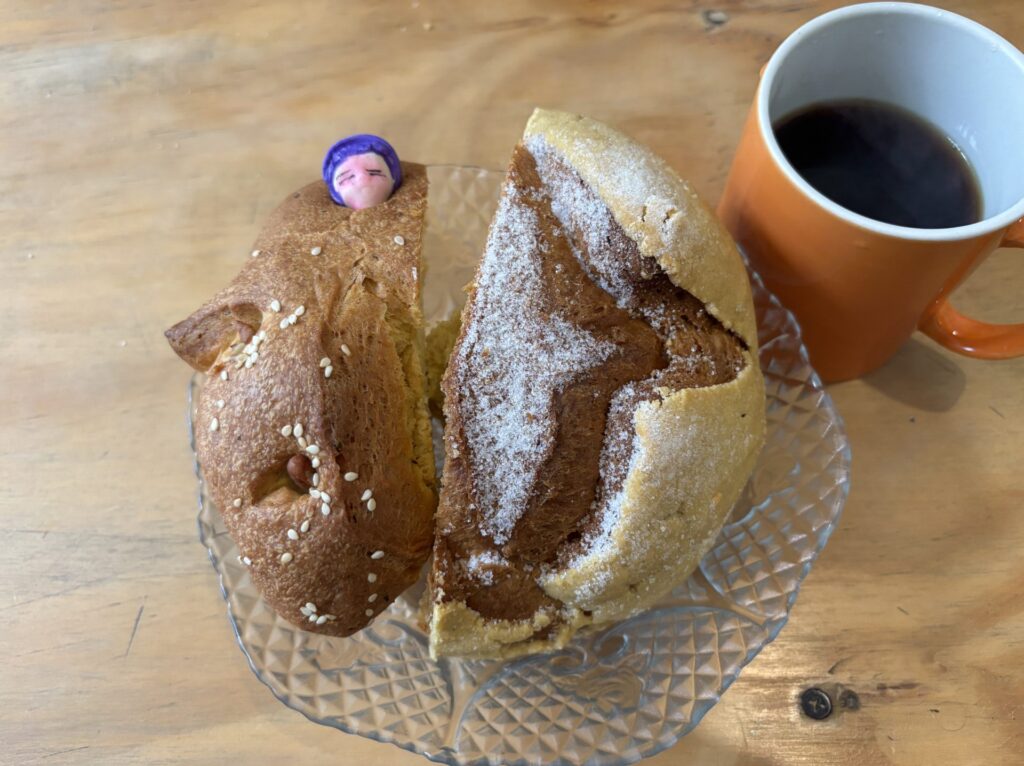 宿の共有スペースでパン・デ・ムエルトの朝食