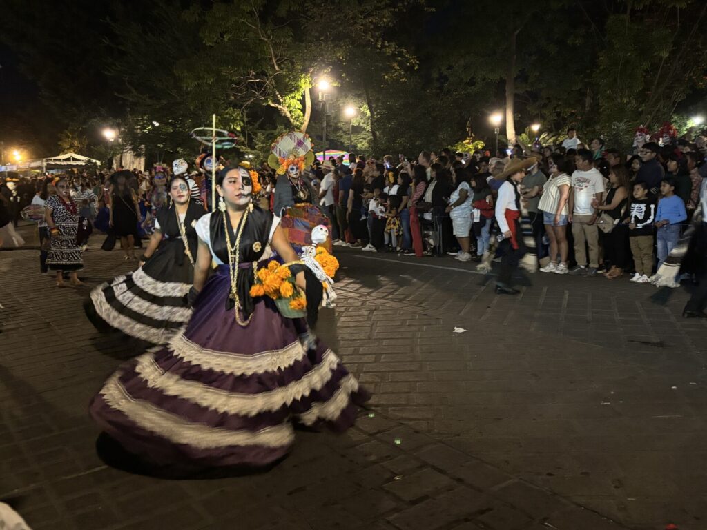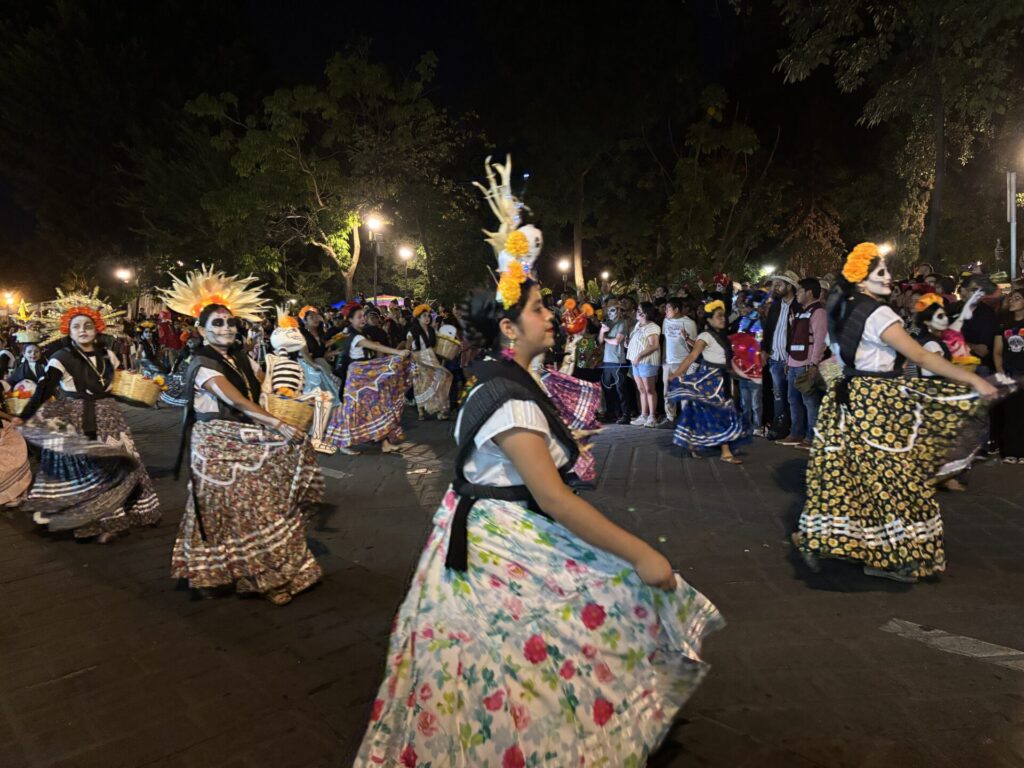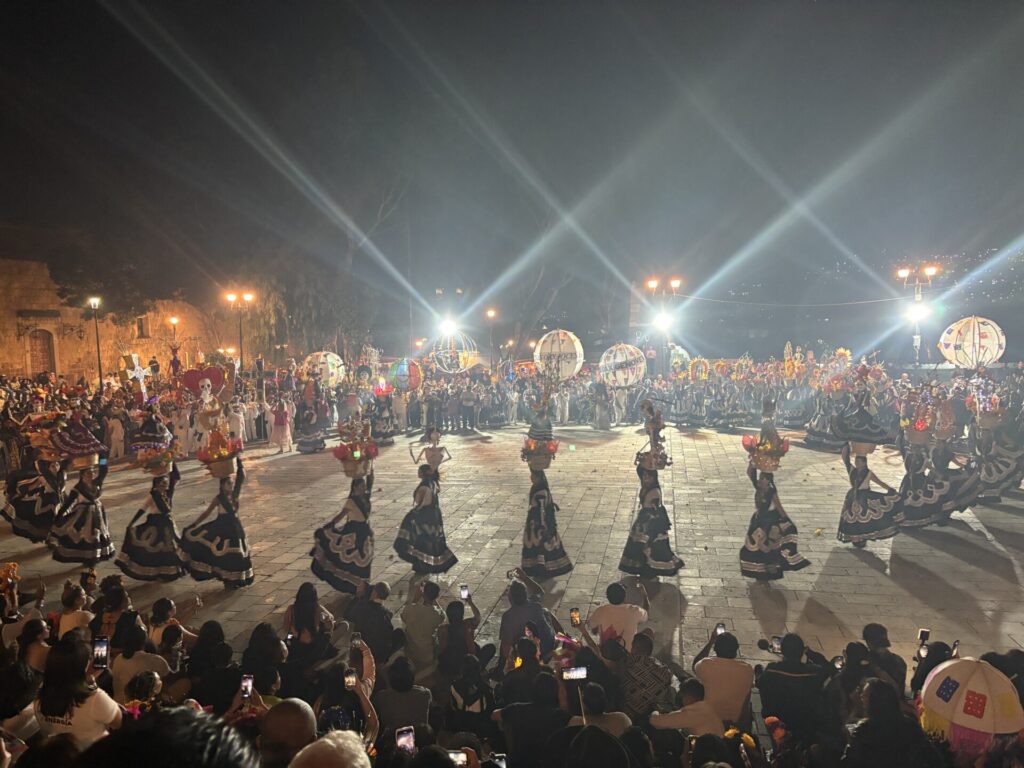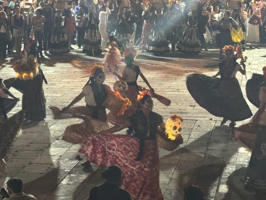 オアハカの伝統衣装をまとった女性たちが、ガイコツのランタンを手に情熱的なダンスを披露。