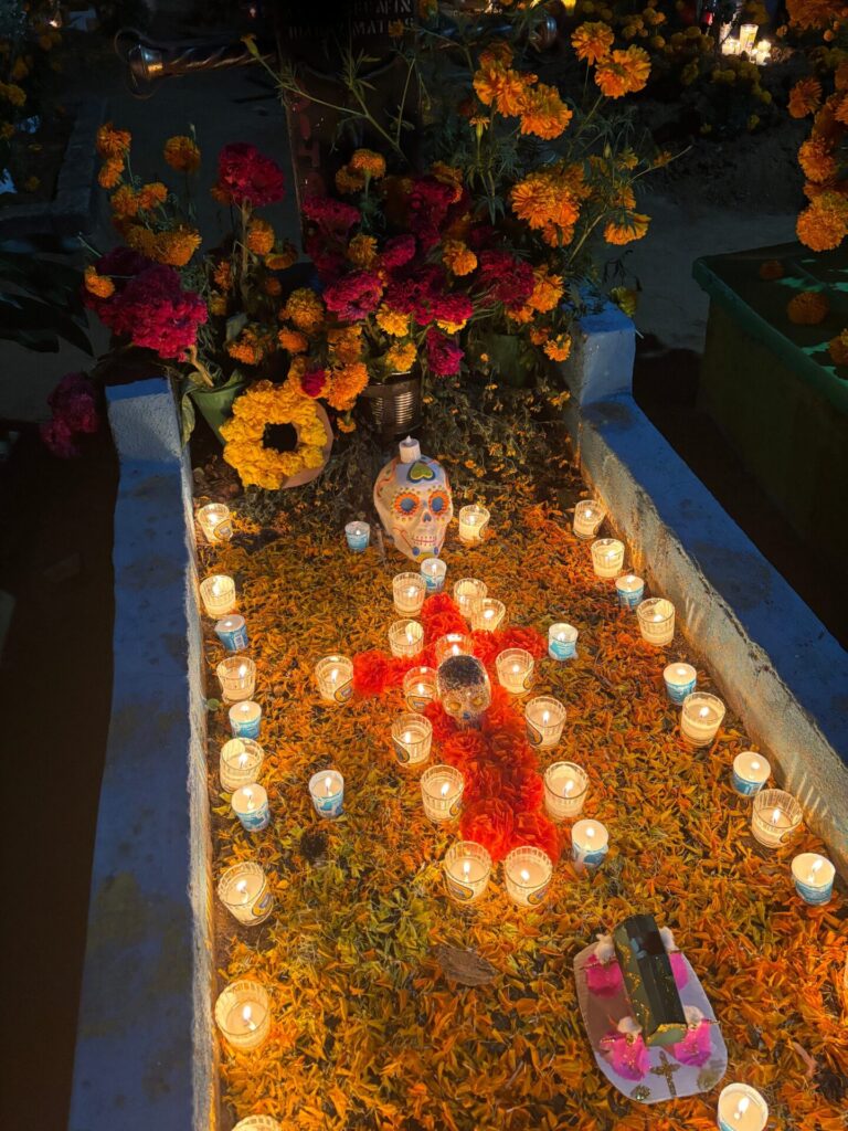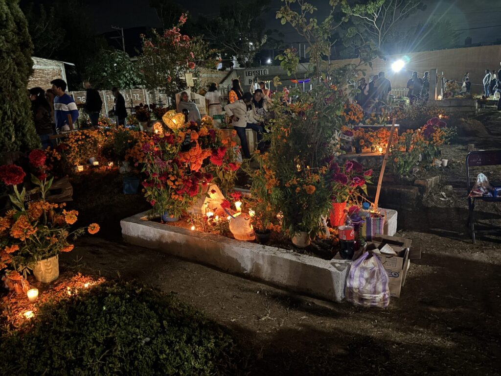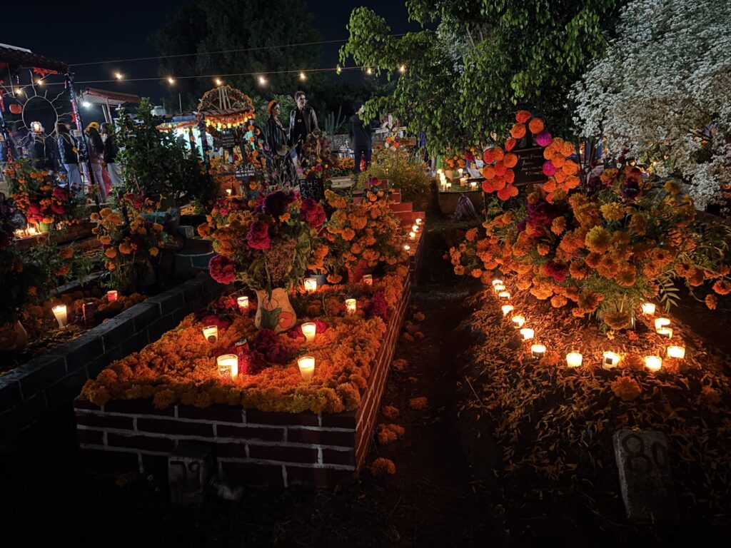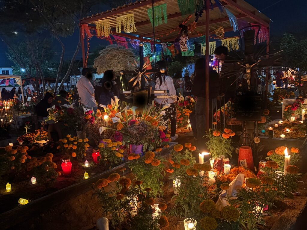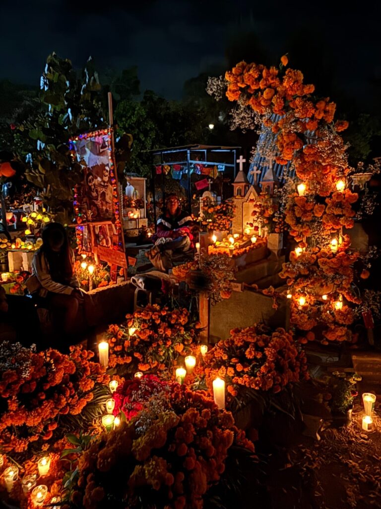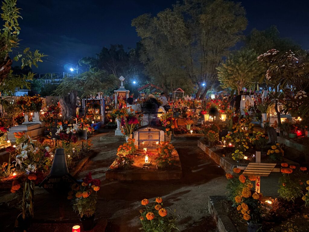 マリーゴールドとろうそくに囲まれた墓、音楽とともに過ごす家族たちの姿に、死と生が自然に共存するメキシコ文化の奥深さを感じる。