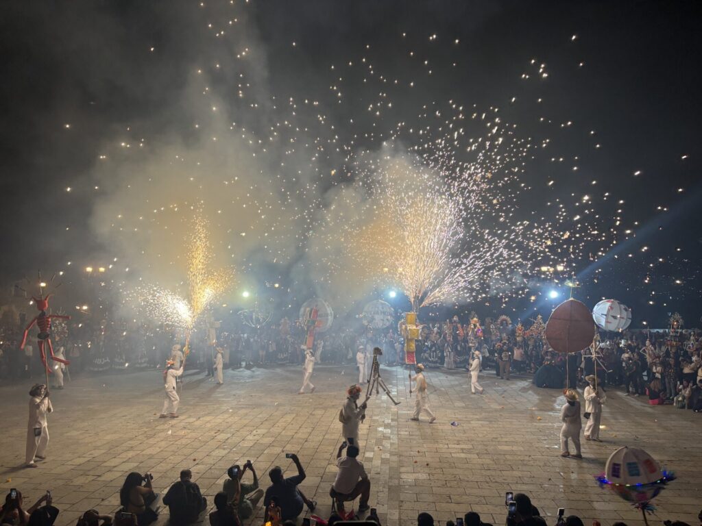 そして11月1日の夜には、花籠を頭にのせて舞う女性たちや、火花を撒き散らす踊り手が登場する、迫力のパレードを広場で体験。