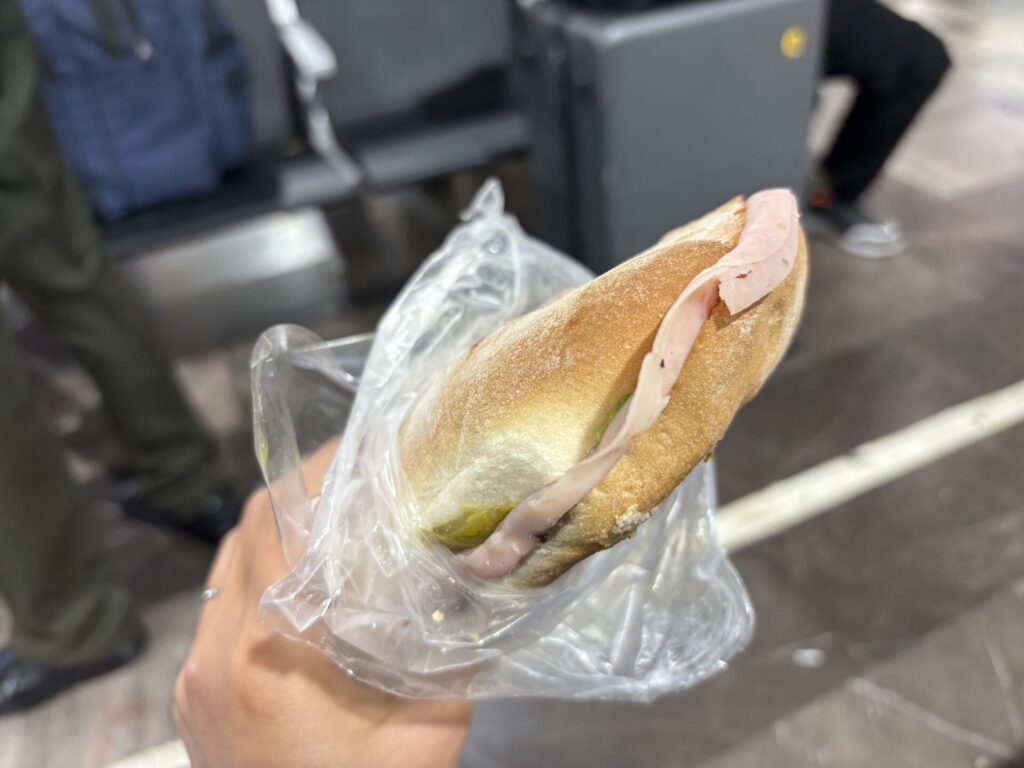 出発まで少し時間があったので、ベンチに座ってサンドイッチで朝ごはんにした。