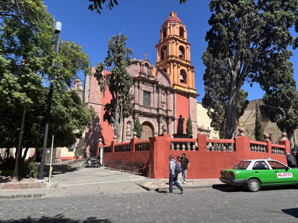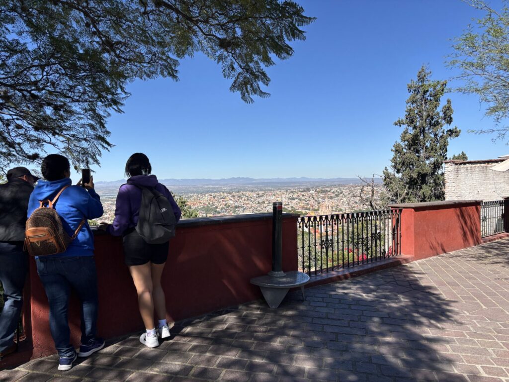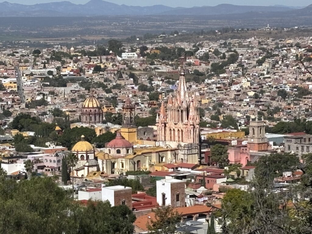 小高い丘の上にあるこの場所からは、カラフルな家々がぎゅっと集まる街並みが広がり、その中にひときわ目を引くピンク色の尖塔──街のシンボル「サンミゲル教区教会(Iglesia Parroquial)」もしっかり見える。