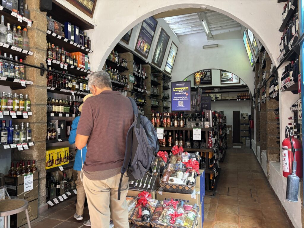 中心地にある酒屋「La Europea」は、テキーラ、メスカル、ワインなど種類豊富。