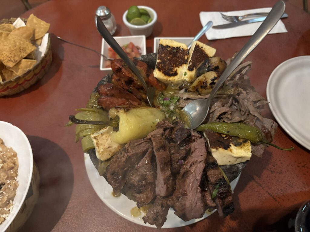 アラチェラ(ハラミ)、セシナ(塩漬け牛肉)、ソーセージ、チーズ、サボテン(ノパル)、野菜が山盛り。