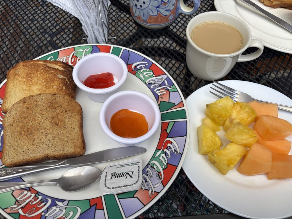用意されているのはパンとフルーツ、コーヒーというシンプルな内容だけど、宿泊代に含まれているのがありがたい。