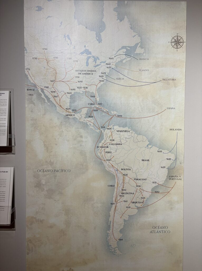 中でも印象に残ったのは、北米・中米・南米の地図に刻まれた、スペインやフランス、イギリス、オランダ、ポルトガルなどの支配の足跡。
