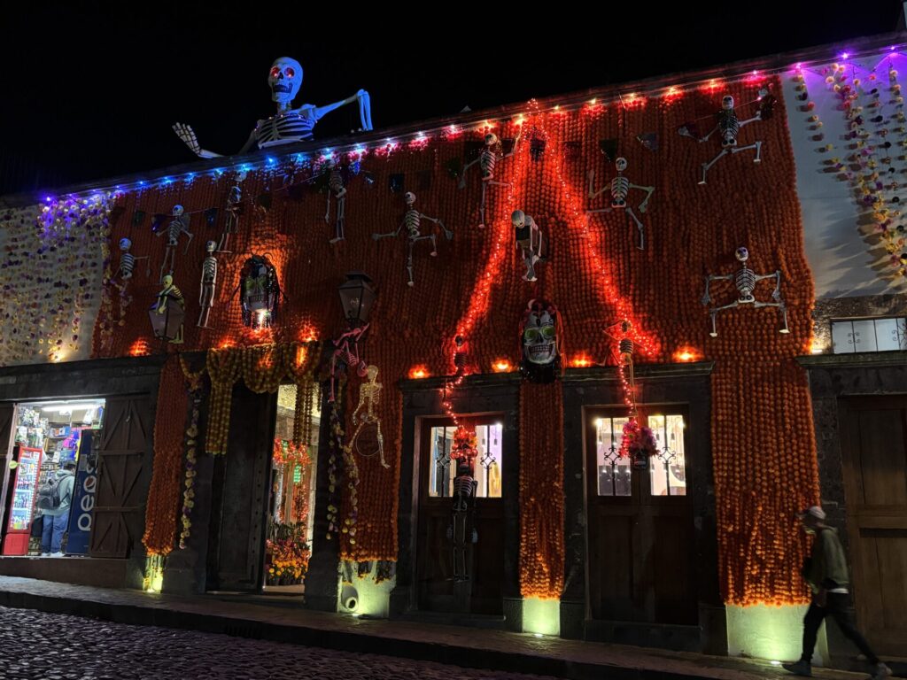 通り沿いには、壁一面にマリーゴールドとガイコツが飾られた華やかな建物が現れ、思わず足を止めてしまう。