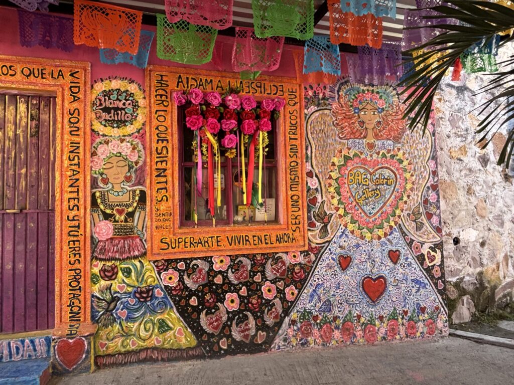 アルテサニアス市場の壁には、フリーダ・カーロ風の絵やハートのモチーフなど、色鮮やかなアートが描かれていて、ついつい写真を撮りたくなるかわいさだった。