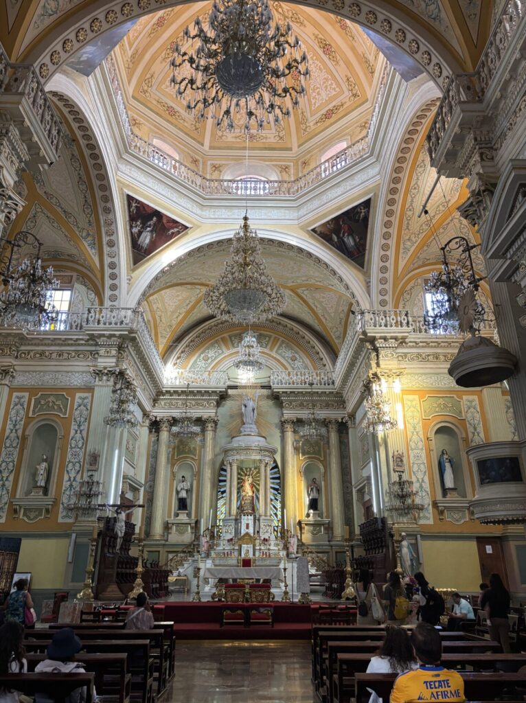 内装は蜂蜜色に輝き、繊細なレリーフや大きなシャンデリアが上品で、あたたかい雰囲気に包まれている。