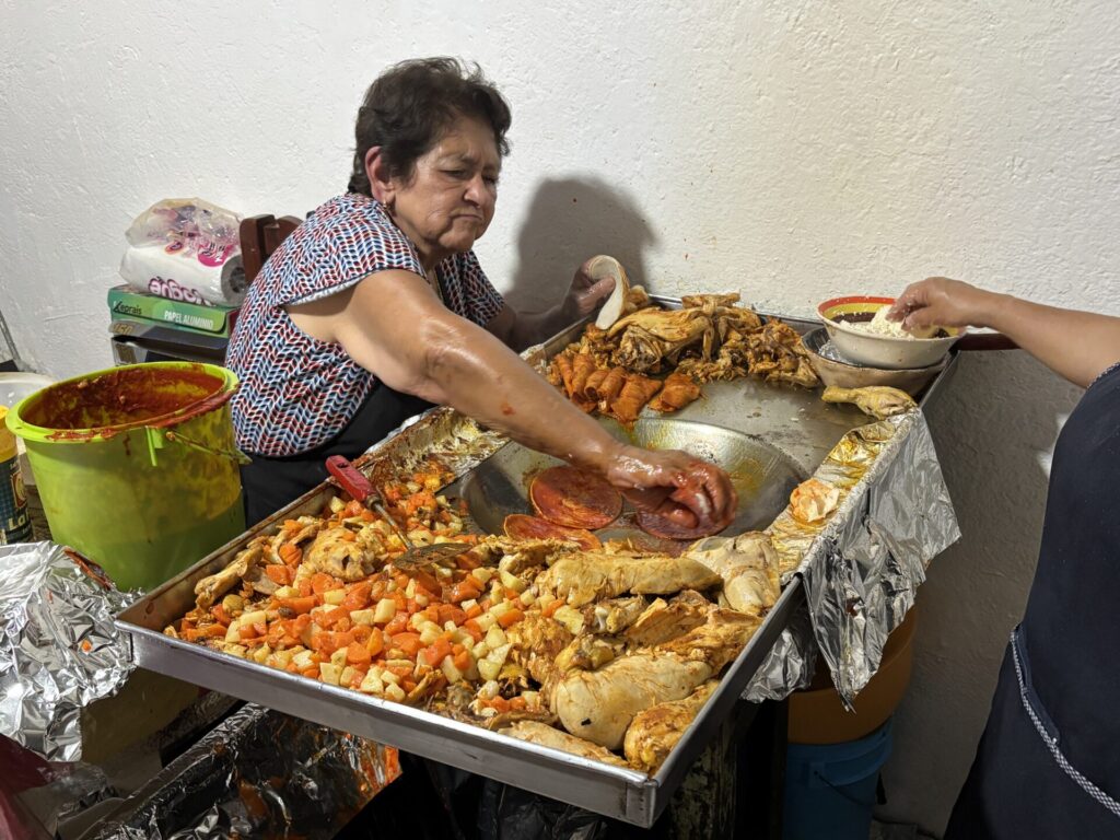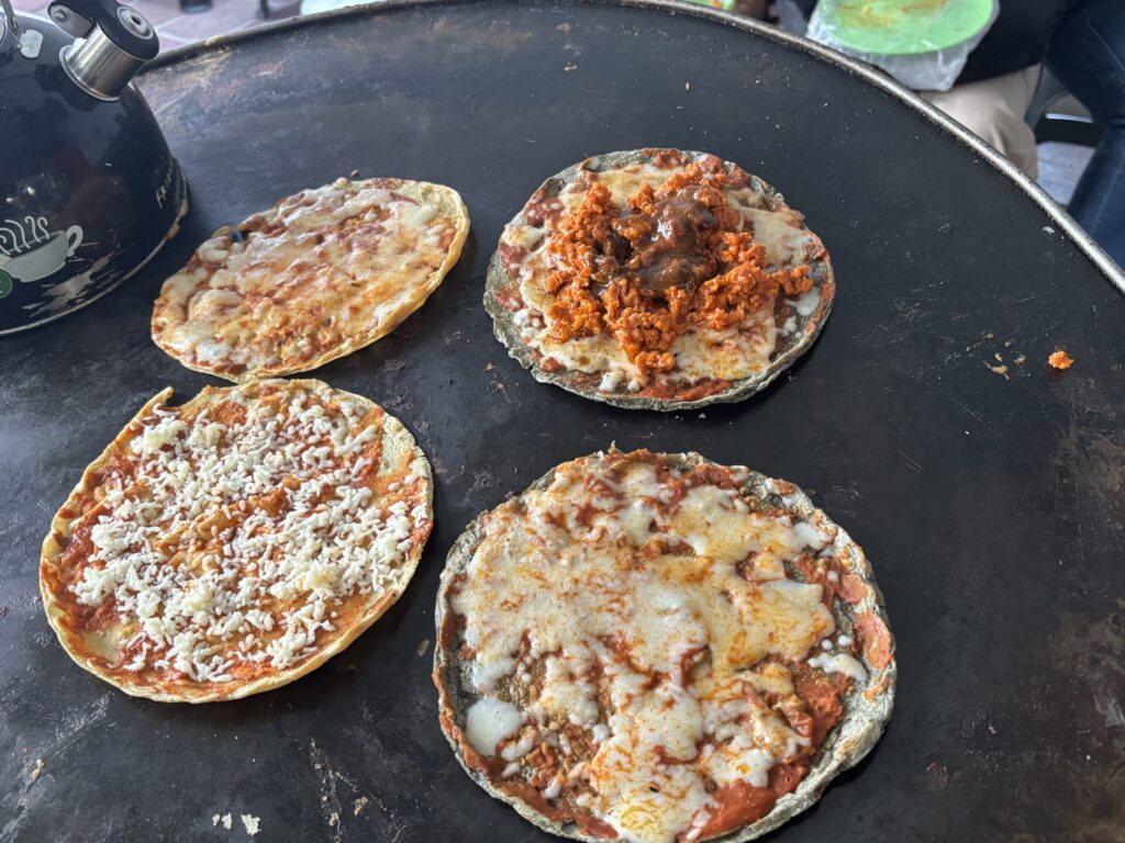 地元の名物・エンチラーダス・ミネラスを味わう定番スポットで、店頭ではおばちゃんが手際よくトルティーヤを焼いている。
