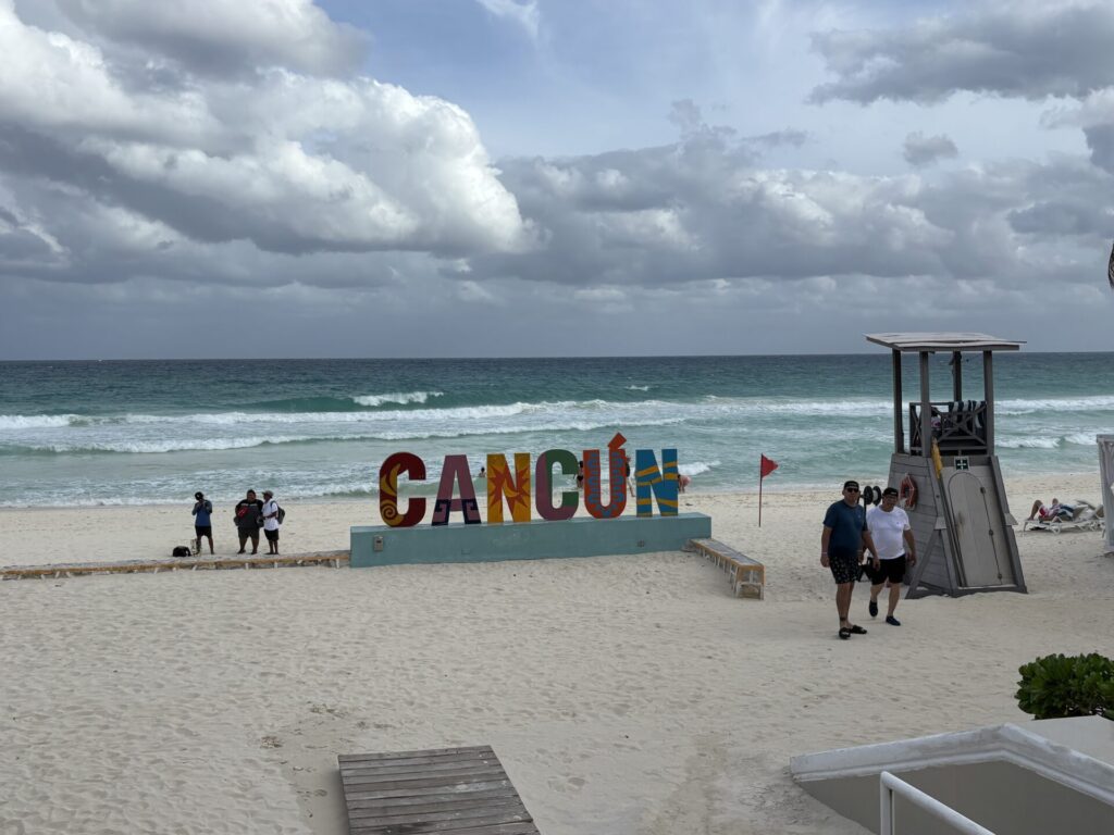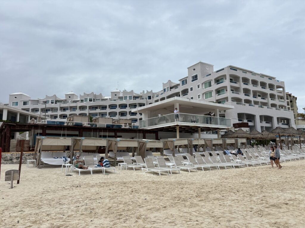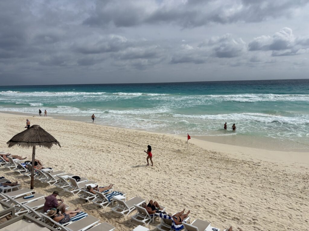 カンクンの魅力といえば真っ白な砂浜と淡いアクアブルーの海だけど、この日はくもりで海の色は控えめ。