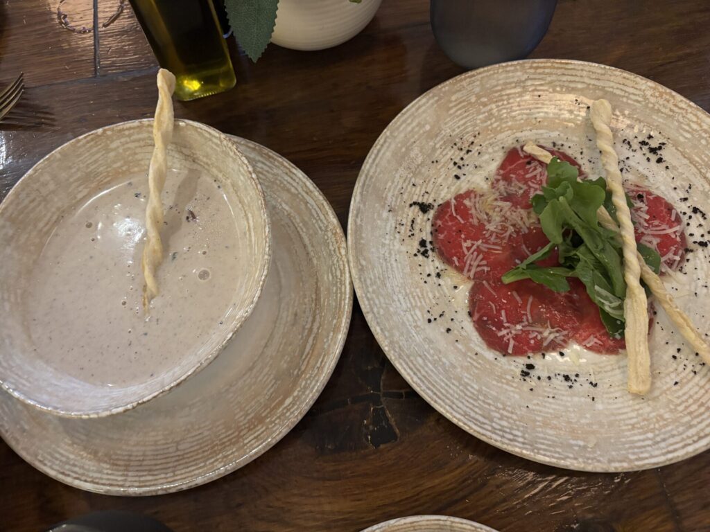 前菜は、パルメザンの香りとルッコラの苦味が心地よい牛肉のカルパッチョ。