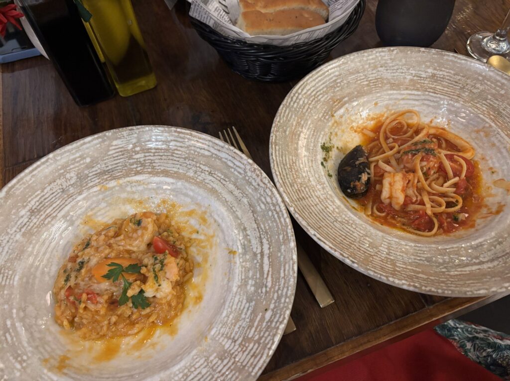 海老の旨みたっぷりのチーズクリームリゾットと、海老・イカ・ホタテ・ムール貝がごろごろ入った“悪魔風”の辛口リングイネ。