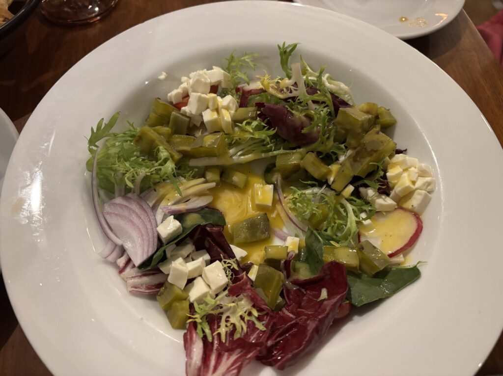 パネラチーズに青リンゴ、チェリートマトなどが入った爽やかな味で、パッションフルーツのドレッシングがよく合う。