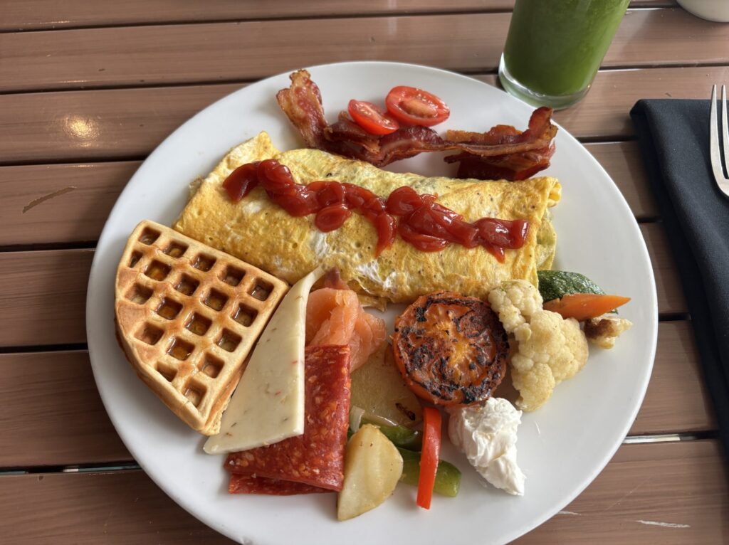 シェフが目の前で具材を選んで焼いてくれるオムレツは種類が豊富で見ているだけでも楽しい。
