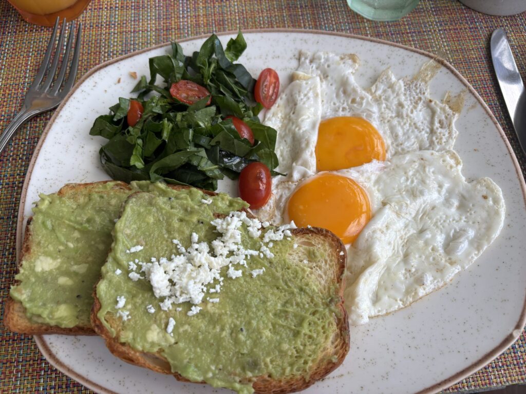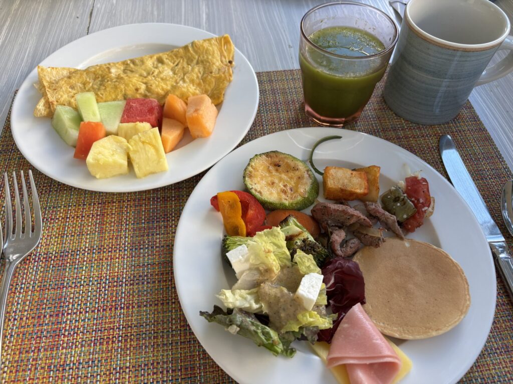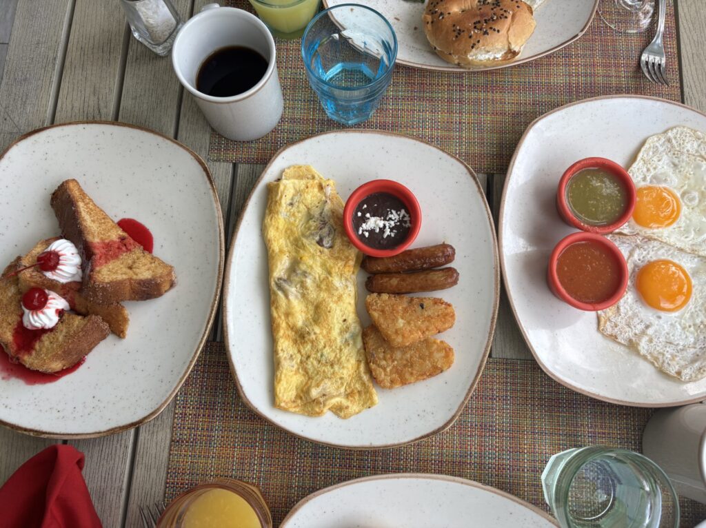 朝食はビュッフェではなくオーダー式で、アボカドトースト、ベーグル、オムレツ、フレンチトースト、目玉焼き、フルーツプレートなど、ついつい欲張ってたくさん注文してしまった。