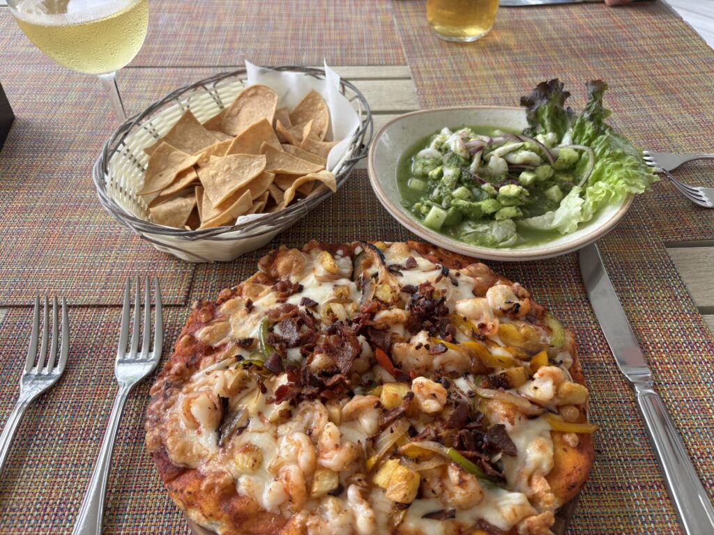お腹は全く空いていないけれど、昼食にはエビのセビーチェとピザ・カリビアンを注文。