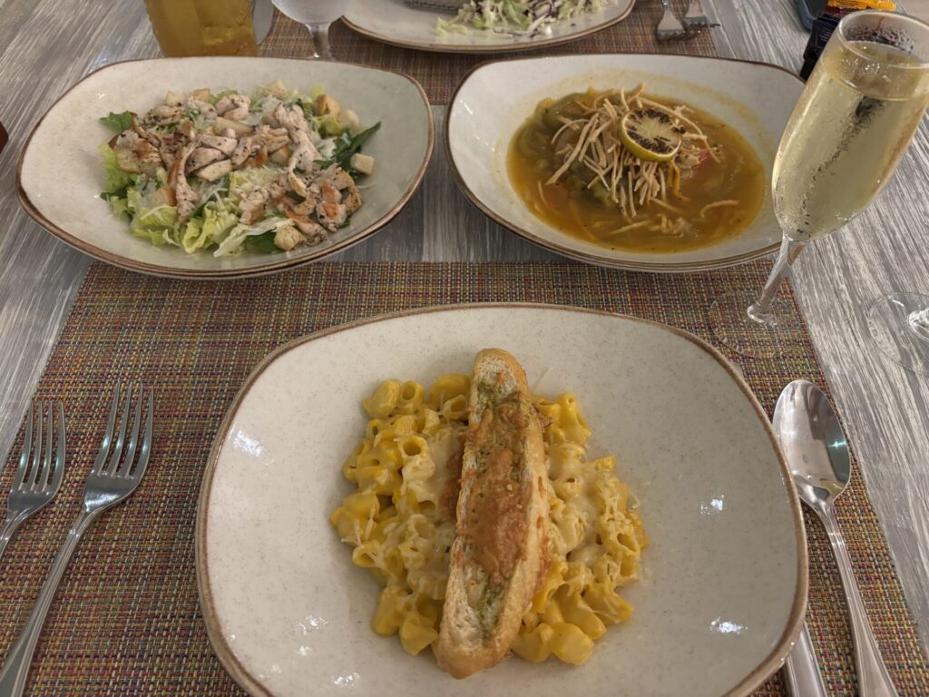 結局、チーズ入りマカロニ、シーザーサラダ、チキン入りライムスープ、メキシカンラップを注文。