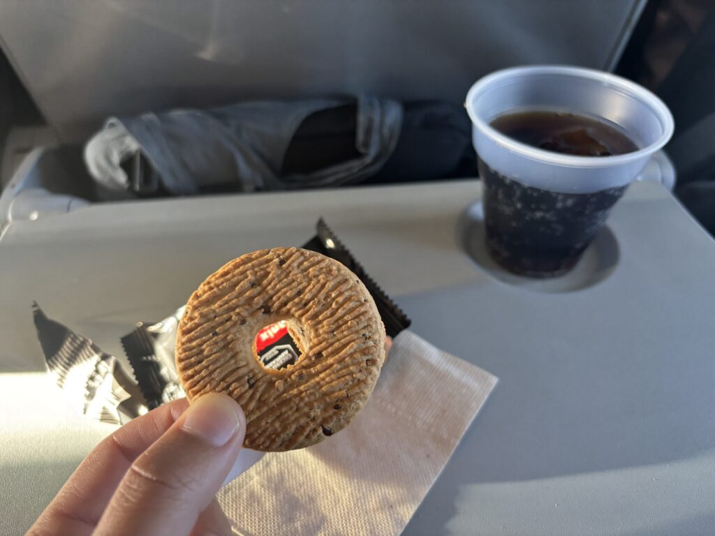 フラッグ・キャリアにもかかわらず、機内食の提供はなく、配られたのはクッキーとジュースのみだった。