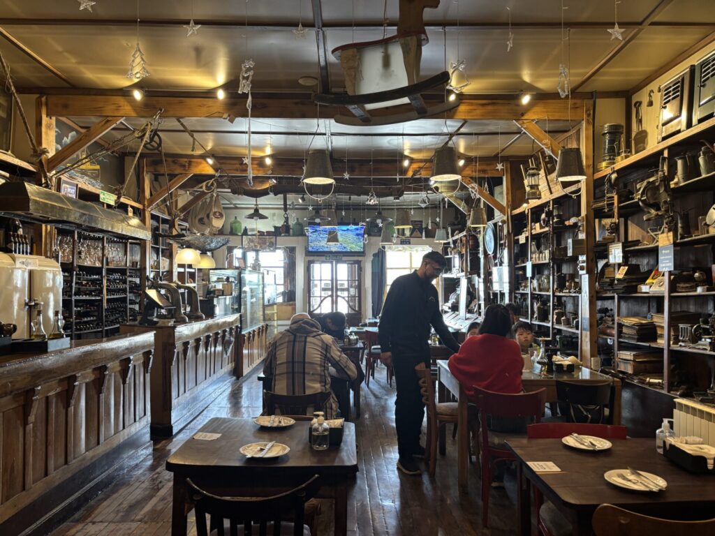 大きな三角屋根と、木を多用した温かみのある内装が印象的で、どこか山小屋のような雰囲気が漂っている。