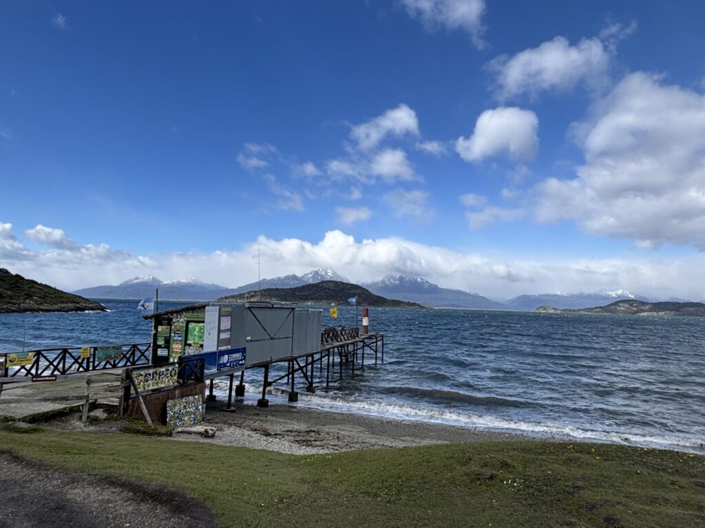 「Tolkeyen Patagonia Turismo – Muelle」社のすぐ目の前にある海沿いの道からは、ウシュアイアのシンボル的存在である山、「シンコ・エルマノス(Cinco Hermanos)」がよく見える。