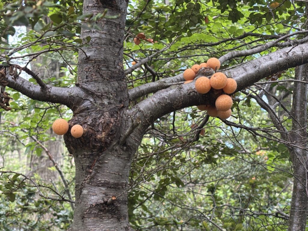 遊歩道を歩いていると、木にぶら下がるオレンジ色の丸い“実”のようなものを発見。