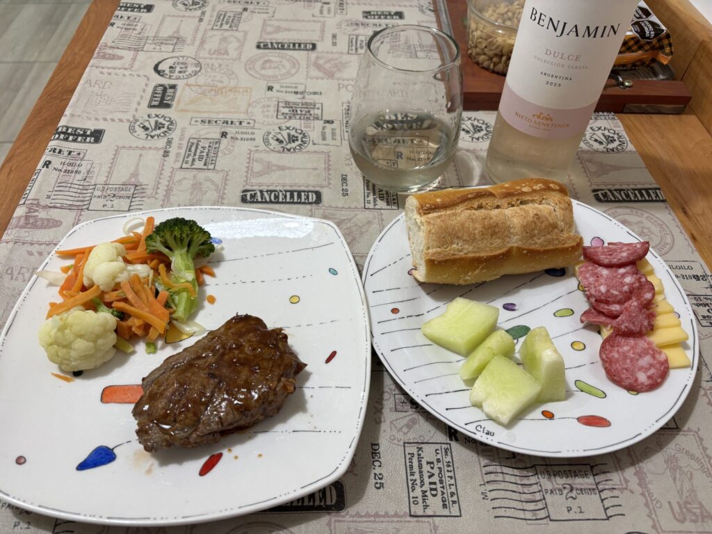 ステーキ、サラミ、チーズ、メロン等の夕食