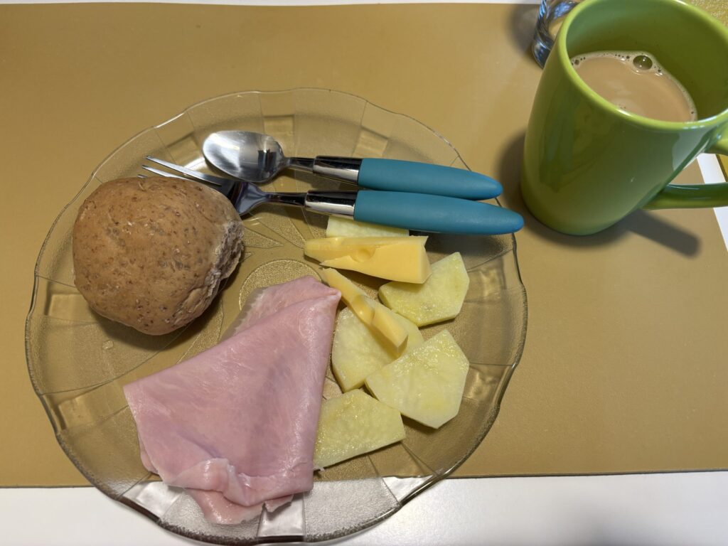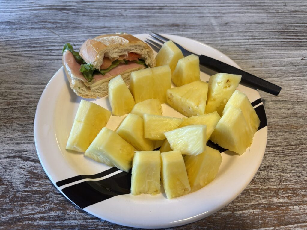 今日の夕食は、父から少し分けてもらったサンドイッチと、大量のパイナップル。